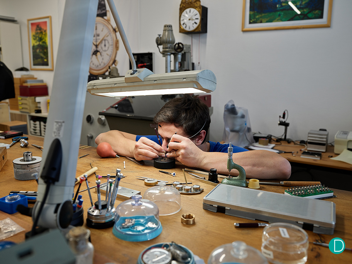 Мастерская находится в современном промышленном здании, прямо по соседству с ателье Доминика Рено. Если вы помните из истории о Petermann Bédat, Доминик принял предложение наставничества в обмен на оплату за помощь в украшении нефункционального прототипа DR01 First Twelve. Насколько нам известно, часы - пока не названные, которые мы будем называть Seconde Morte.