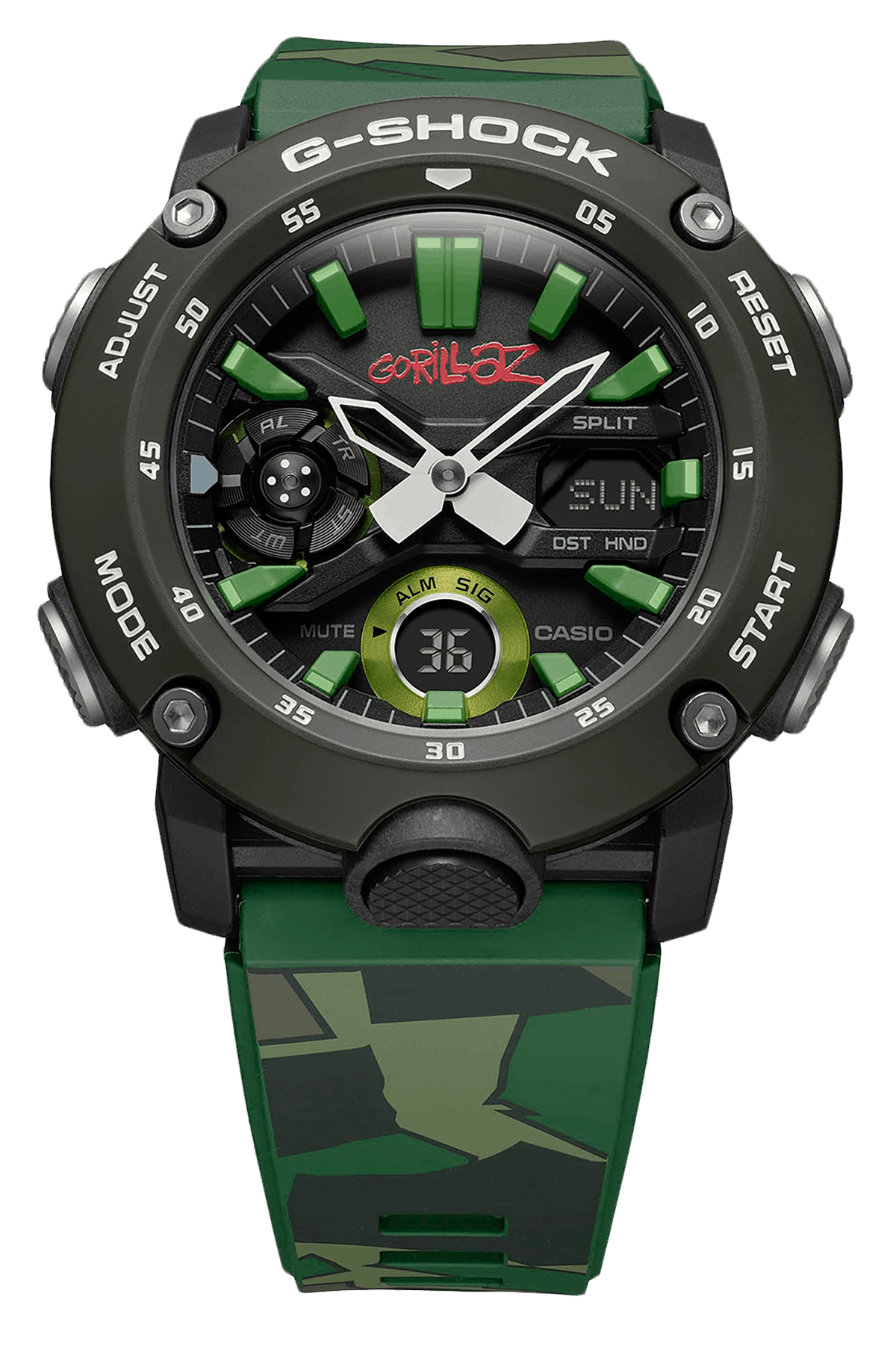 GA-2000 выглядит совсем по-другому. Он использует выдающийся камуфляж как дань художественному оформлению одноименного дебюта Gorillaz, который, если вы можете в это поверить, был выпущен еще в 2001 году. Это издание поставляется с двумя ремешками, оба камуфляжными, но один намного более темным тоном, который, я думаю, делает зеленый на циферблате действительно всплывающим. Как и следовало ожидать, обе модели часов поставляются в упаковке, которая изобилует вдохновленными рисунками Gorillaz, которые соответствуют часам внутри, с DW-5600 в традиционной жестяной банке G-Shock и GA-2000 в красивой подарочной коробке.