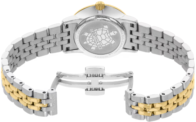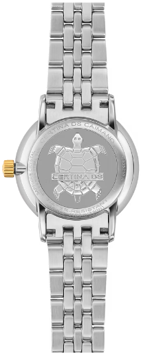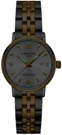 Неподвластная времени красота DS Caimano Lady делает их идеальным партнером для жизни. Элегантные, как ювелирный шедевр, эти классические часы никогда не утратят привлекательности - идеальны для женщин, любящих носить стильные аксессуары. Для корпуса, браслетов и застежек своих часов марка Certina использует нержавеющую сталь 316L, отличающуюся повышенной износостойкостью, устойчивостью к коррозии и гигиеничностью. В стали содержится совсем небольшое количество никеля, поэтому этот материал не вызывает аллергии при носке. PVD - это сокращение от «physical vapour deposition», обозначающее современный метод нанесения покрытий, при котором на изделие из стали и титана особым способом напыления наносится другой материал, например, золото. Такой тип напыления не только украшает изделие, но и обладает высокой стойкостью. Покрытие PVD очень твердое, устойчиво к механическим повреждениям и коррозии. Super-LumiNova (SLN) представляет собой cветящийся материал с фосфоресцирующими свойствами. В темноте SLN типа BG W9, который использует Certina, испускает свет в виде голубого мерцания. SLN не вредит здоровью и используется для нанесения на стрелки, индексы и безели. В темноте он через некоторое время теряет свои фосфоресцирующие свойства, но они автоматически восстанавливаются на свету. Сапфировое стекло состоит из порошка оксида алюминия (Al2O3), раскаленного до 2.000 °C. Получаемые в результате сапфировые пласты нарезаются на тонкие пластины, им придают требуемую форму и полируют. Сапфир абсолютно прозрачен, обладает высокой устойчивостью к царапинам и механическим повреждениям. По этим причинам сапфировое стекло стало неотъемлемой деталью концепции DS и используется во всех моделях Certina для защиты циферблата. Вес нетто 60 гр. Водонепроницаемость 10 бар (100 м). Диаметр корпуса 28 мм. Толщина 6.9 мм. Между креплениями 14 мм. Покрытие Superluminova - SLN – это сокращение от Super-LumiNova, фосфорицирующее люминесцентное покрытие. Certina отдает предпочтение покрытию типа BG W9, дающему в темноте голубоватый свет. Покрытие SLN безопасно для здоровья и используется для отделки стрелок, часовых отметок и безелей. При длительном нахождении в темноте интенсивность света слабеет, но при попадании солнечных лучей автоматически возобновляется. Кварцевый механизм F03.412 ETA с PrecidriveTM и индикатором окончания срока службы элемента питания. PrecidriveTM - название инновационной технологии, обеспечивающей исключительную точность хода изделий Certina: Точность часов с кварцевым калибром Precidrive может сравниться с хронометрами. Часы Precidrive с погрешностью до +/-10 секунд в год в 8–10 раз точнее обычных кварцевых часов. Некоторые кварцевые часы Certina – как, например, все модели Precidrive, будь то вариант с тремя стрелками или хронограф – имеют указатель окончания срока службы элемента питания (EOL). Эта функция позволяет узнать, когда завершится срок службы элемента питания: В этом случае секундная стрелка движется с интервалами в 4 секунды, и элемент питания необходимо заменить в течение двух недель.